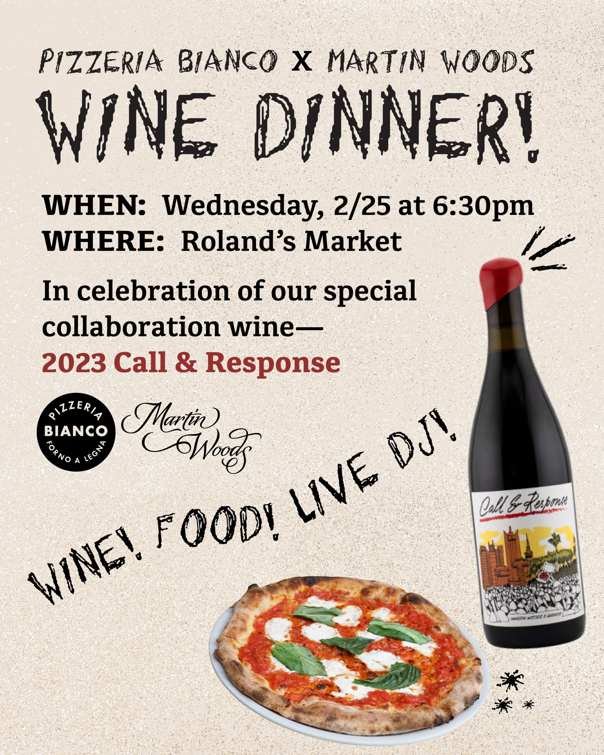 Pizzeria Bianco is excited to be hosting a special wine-and-pizza night with Martin Woods Winery, in celebration of our collaboration wine— 2023 Call & Response. Our special collaboration wine will be served alongside our wood-fired pizza, in addition to other courses featuring some of our favorite dishes from Pizzeria Bianco.